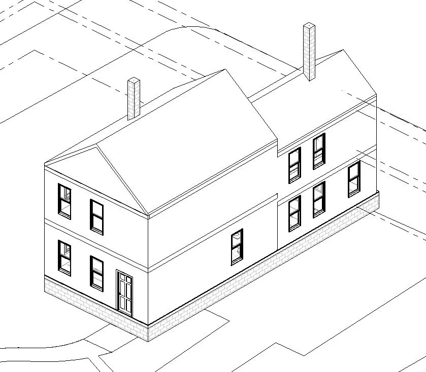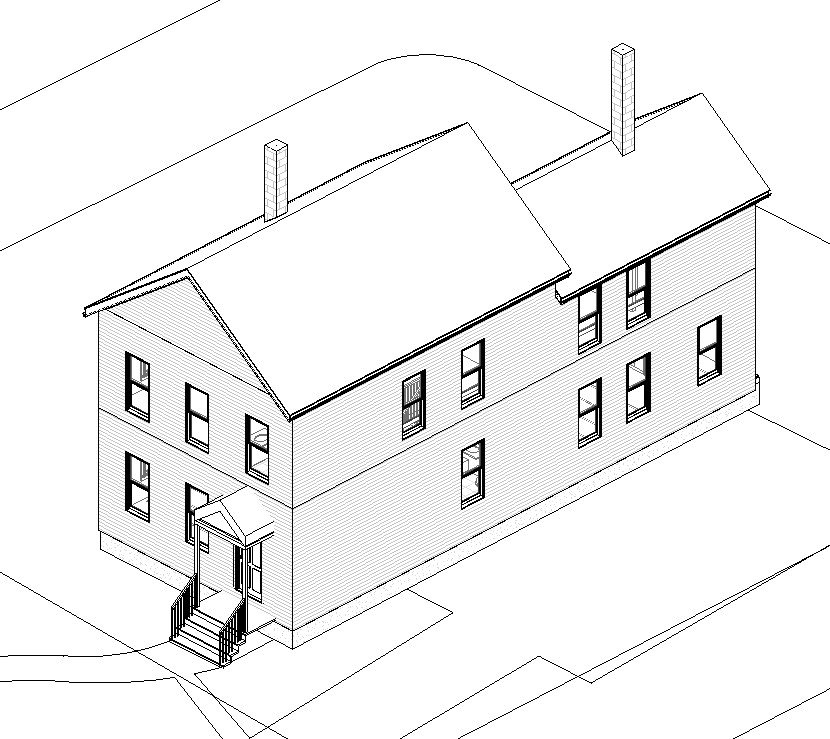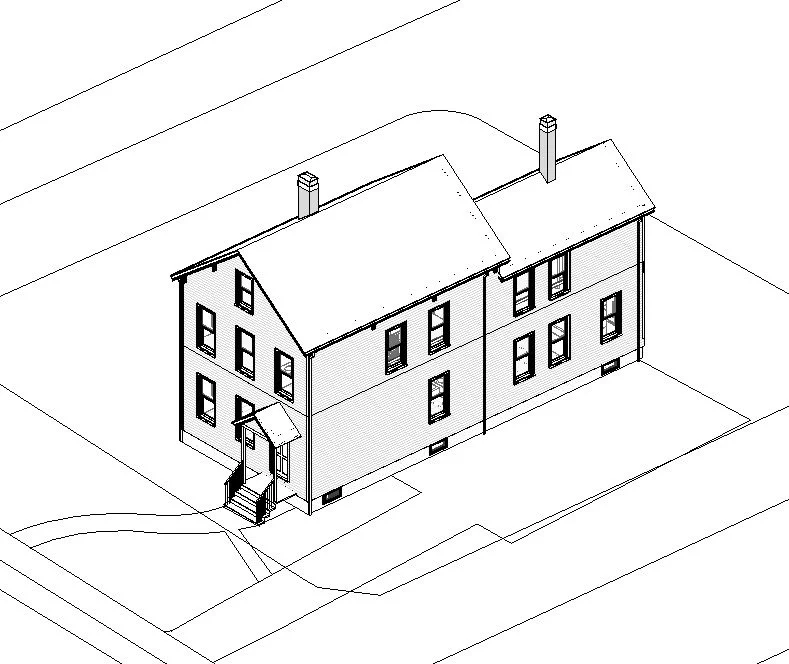 Lastly I add in door & window trim, correct the front porch roof, adjust the chimney heights, add in gutters and downspouts and some decorative brackets that I observed on site and I’m about ready to go into the schematic design phase. To be clear, this model isn’t a 100% perfect reflection of reality, it’s actually a work in progress that will continue to be updated throughout the design process, which is always the case in a renovation/addition project. We’re constantly learning new things about the buildings we’re working on and updating the drawings to reflect that. However, what I have at this point is enough to confidently begin exploring what the options are.