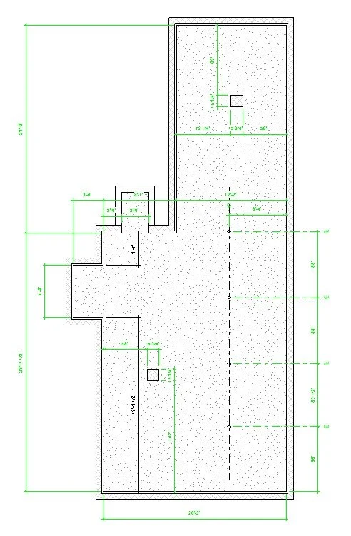 I draw the walls and floor and then add green dimension strings for the areas that I’m sure are correct and keep the ones I’m less sure of black. I’ll come back to those later.
