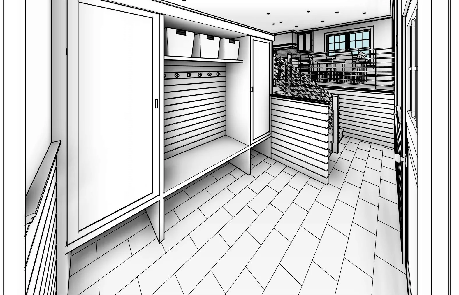 The lot was very small (despite at how open the renderings make it seem!) and Newton zoning regulations didn’t give us much room for expansion, and so the addition ended up being single story, but with a flat roof it gives the family the opportunity to have a second floor deck off the kids bedrooms. The new entry door leads to a mudroom that is halfway between the basement and first floor level and we take advantage of this height for tall windows with transoms to let in light from the south and west - a high priority for the homeowner!