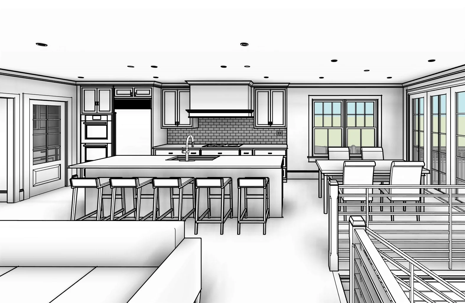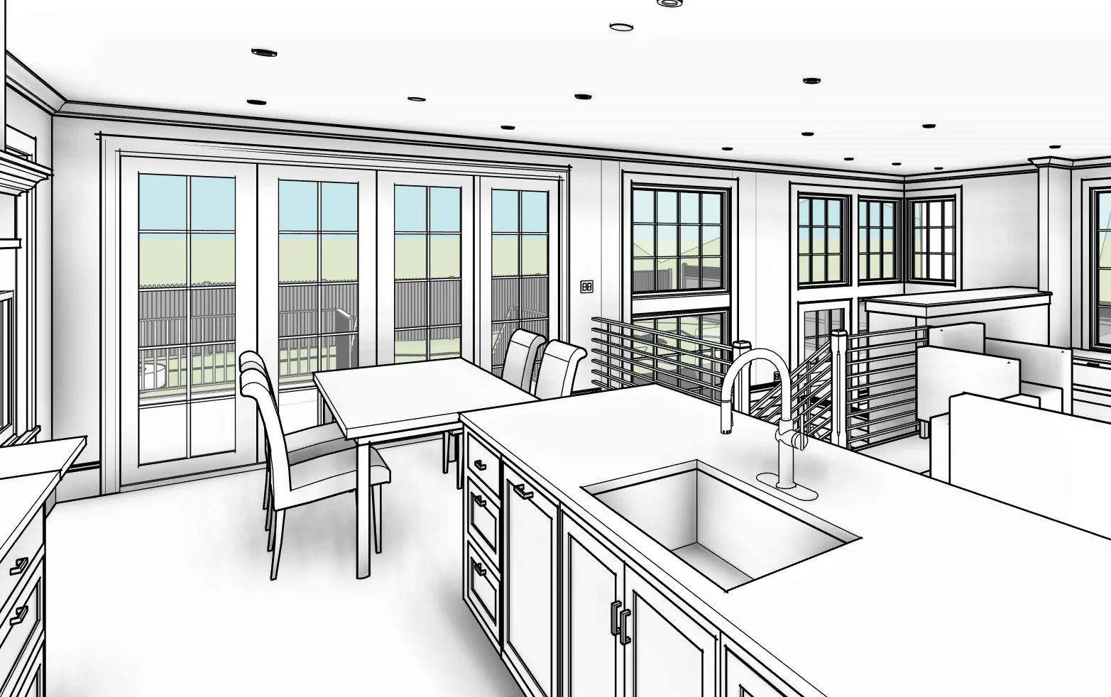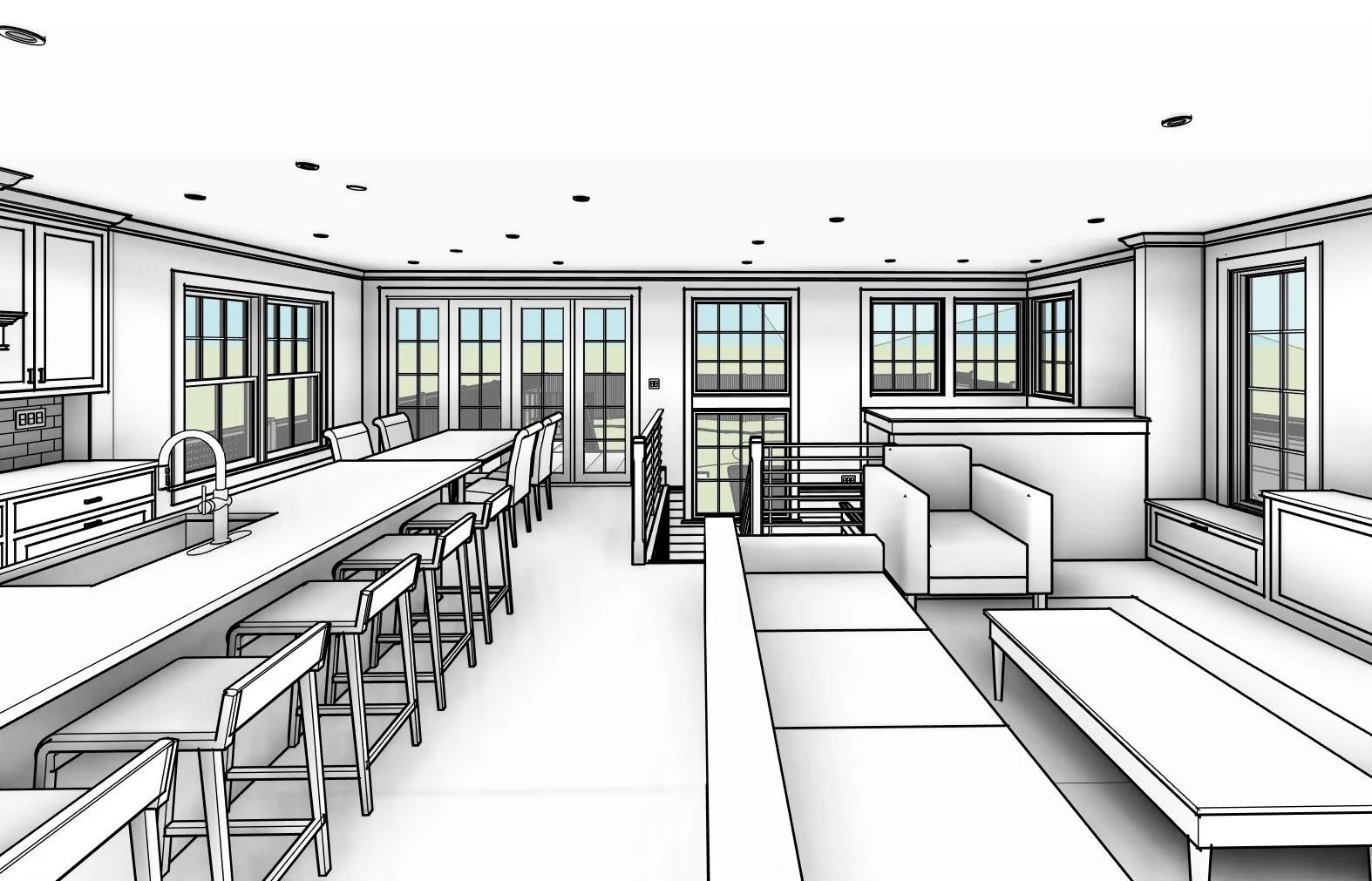 The addition becomes one open space with the kitchen connecting to the family room, eating area and looking across the mudroom towards the outdoors. The intention is for this to be as light-filled as possible, and I will note that we took into account the tree cover on lot the and surrounding area and so it the light should be not be overpowering.
