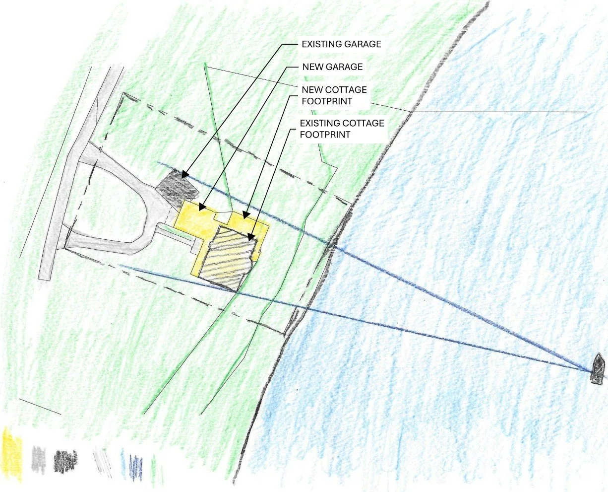 The property has been the locus of family memories for three generations now and the house there well-used, but at this point has outlived it’s useful life and with the passing of the first generation it’s time to start fresh with something that would serve the third and successive generations. The highest design priority (even before number of bedrooms and bathrooms) from the homeowner was that the new structure not only be in keeping with the context of the other cottages that surround the lake, but that it also not appear to be a bigger house as seen from the lake. To the homeowner this means that the new structure not be wider than the existing combination of the cottage detached garage. I like a restriction like this a lot, it reduces impact of construction on the landscape and gives me a nice challenge to work within. The program of the cottage is 5 bedrooms (allows for kids, guests and future grandchildren), kitchen, dining, family room, mudroom and screened in porch - a lot to fit into a small footprint, but as you can see in the site sketch below, we made it work.