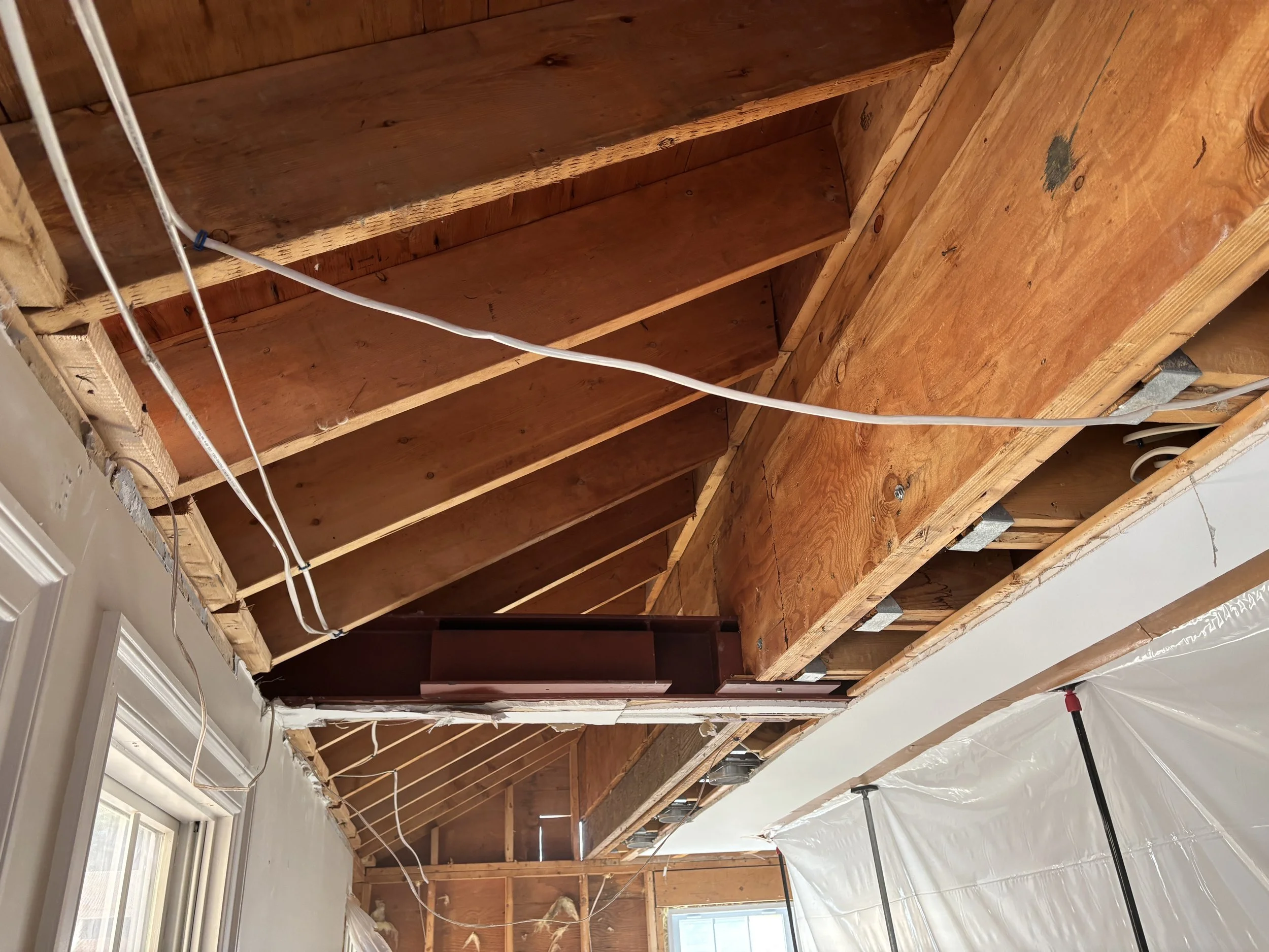 Around the corner framing on an addition has progressed to the point that it’s time to integrate into the existing second floor framing. This led to the uncovering of an unexpected assembly of a 7 1/4” LVL beam (which we knew about) resting on a previously unknown steel beam running deep into the house, and an 18” LVL that will be in the way of a new doorway on the second floor. This has lead to many calls to the engineer and now we think we’ve got it figured out.